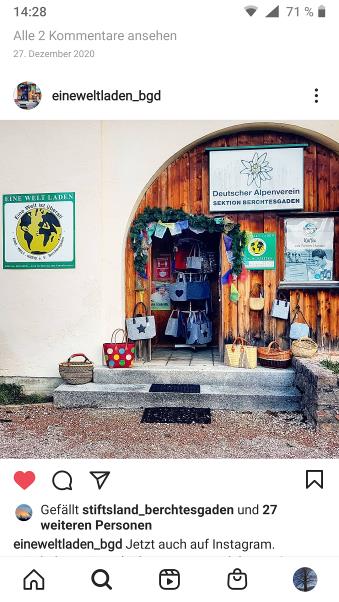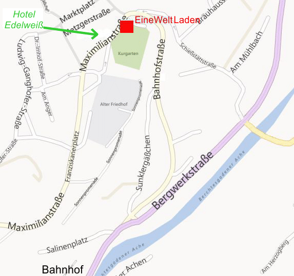 • 2013, als der Nationalpark Berchtesgaden umzog ins neu erbaute »Haus der Berge« und die Caritas Berchtesgadener Land ins Franziskanerkloster einzog, brauchte der »EineWelt-Laden« eine neue Bleibe. Dank Bürgermeister Franz Rasp (Berchtesgaden) und des Vorsitzenden des DAV Berchtesgaden, Beppo Maltan, konnte der Verkaufsraum im Kurgarten bezogen werden.