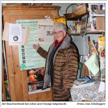Die Vorsitzende des »Eine-Welt-Kreises« Berchtesgaden, Annegret Gaffal, und ihr Team geben den Laden mit fair gehandeltem Kaffee, Tee, Kakao und Kunsthandwerk aus vorwiegend Ländern der Südhalbkugel auf. Wo der alte Bauernschrank, den der »Eine-Welt-Laden« von Standort zu Standort mitgenommen hat, dann hinkommt, weiß Annegret Gaffal noch nicht.