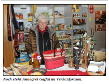 Der »Mietvertrag« (Anm. d. Red.: Der Verein muss nur die Nebenkosten bezahlen) ist gekündigt. Die Ware, die nicht mehr verkauft wird, will Annegret Gaffal »EineWelt-Läden« im Landkreis geben. »Das wird vor allem Handwerkskunst sein«, vermutet sie. Die Lebensmittel gehen gut. Vor allem Kaffee, Wein und Tee sowie die Berchtesgadener Schokolade wandere oft über den Ladentisch. Annegret Gaffal hat damit auch immer die Geschenkkörbe, die sie im Auftrag der Marktgemeindeverwaltung zusammengestellt hat, bestückt. »Das wird künftig jemand anders tun müssen«, bemerkt sie und wirkt ein bisschen traurig. Und Geschäfte und Gastronomie in der Umgebung, für die sie bei den Handelspartnern Waren bestellt, werden sich selbst darum kümmern müssen. »Dann kommen die Paletten nicht mehr in Bischofswiesen an.« Und was passiert mit dem Bauernschrank? Der hat Annegret Gaffal mit dem Laden 31 Jahre lang begleitet. Hoffentlich findet der Schrank einen Platz im Hause Gaffal, um ein paar Erinnerungsstücke unterzubringen.